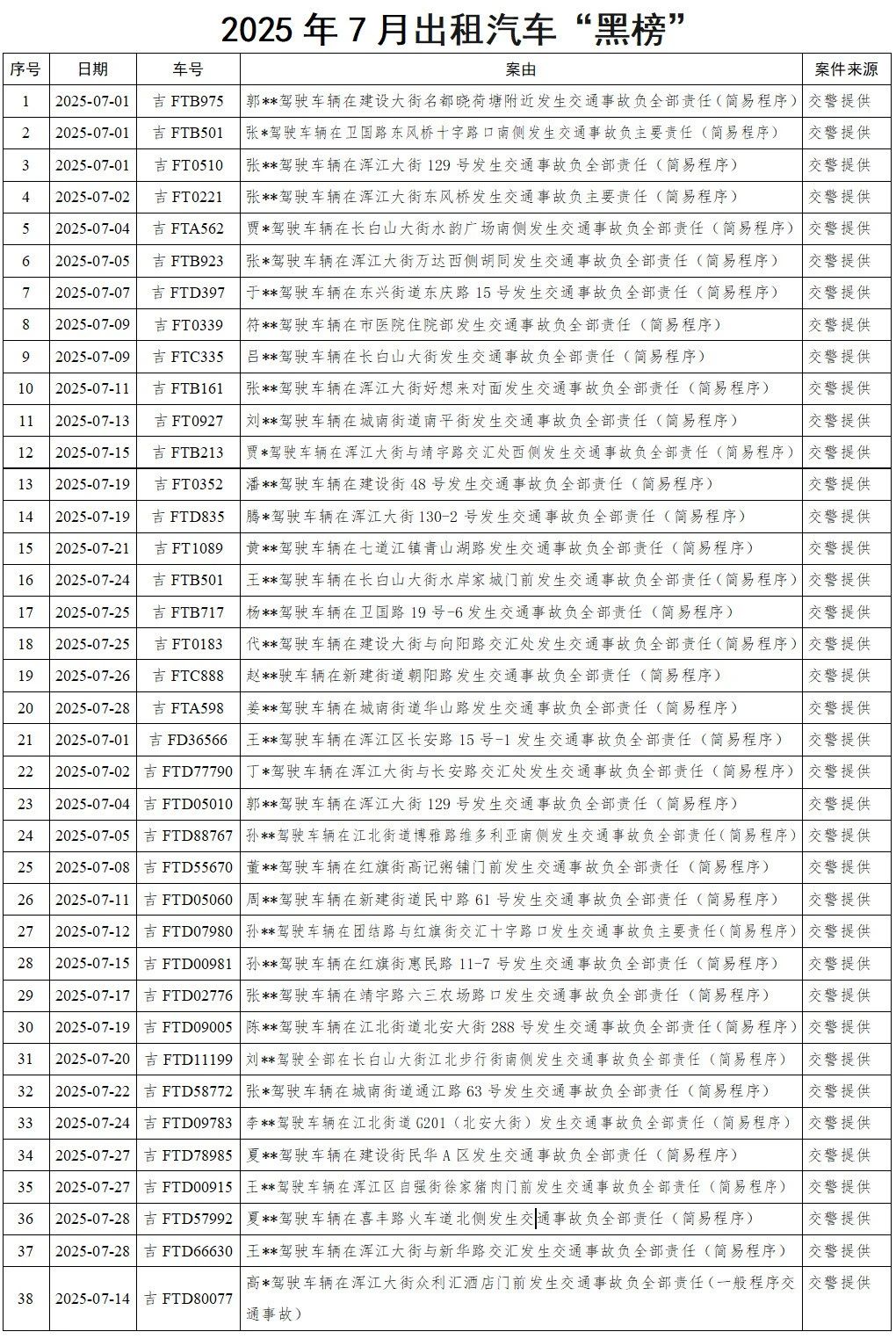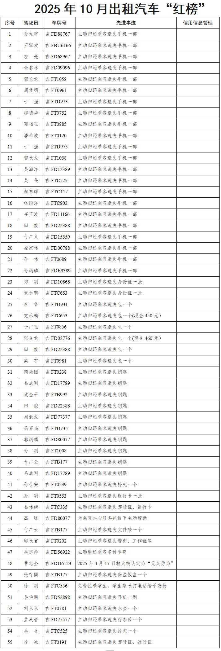 为进一步提升出租汽车行业文明服务水平,现将2025年10月份“城市流动新名片”创建活动情况予以公告:出租汽车“红榜”55人,主动归还丢失物品55人次,其中:归还手机22部,钥匙10把,包6个,身份证2张,现金910元,其他物品15件;出租汽车“黑榜”55人,其中:拒载1人,未按规定使用合格计价器2人,发生交通事故负主要责任以上52人。经调查,10月份市区内出租汽车交通事故69起,其中:承担事故全责52起,占总数75.36%;承担次要责任和无责任17起。在此倡导出租汽车经营者及驾驶员要引以为戒,进一步加强教育和培训,自觉遵守相关法律、法规,让安全文明行车成为良好习惯。